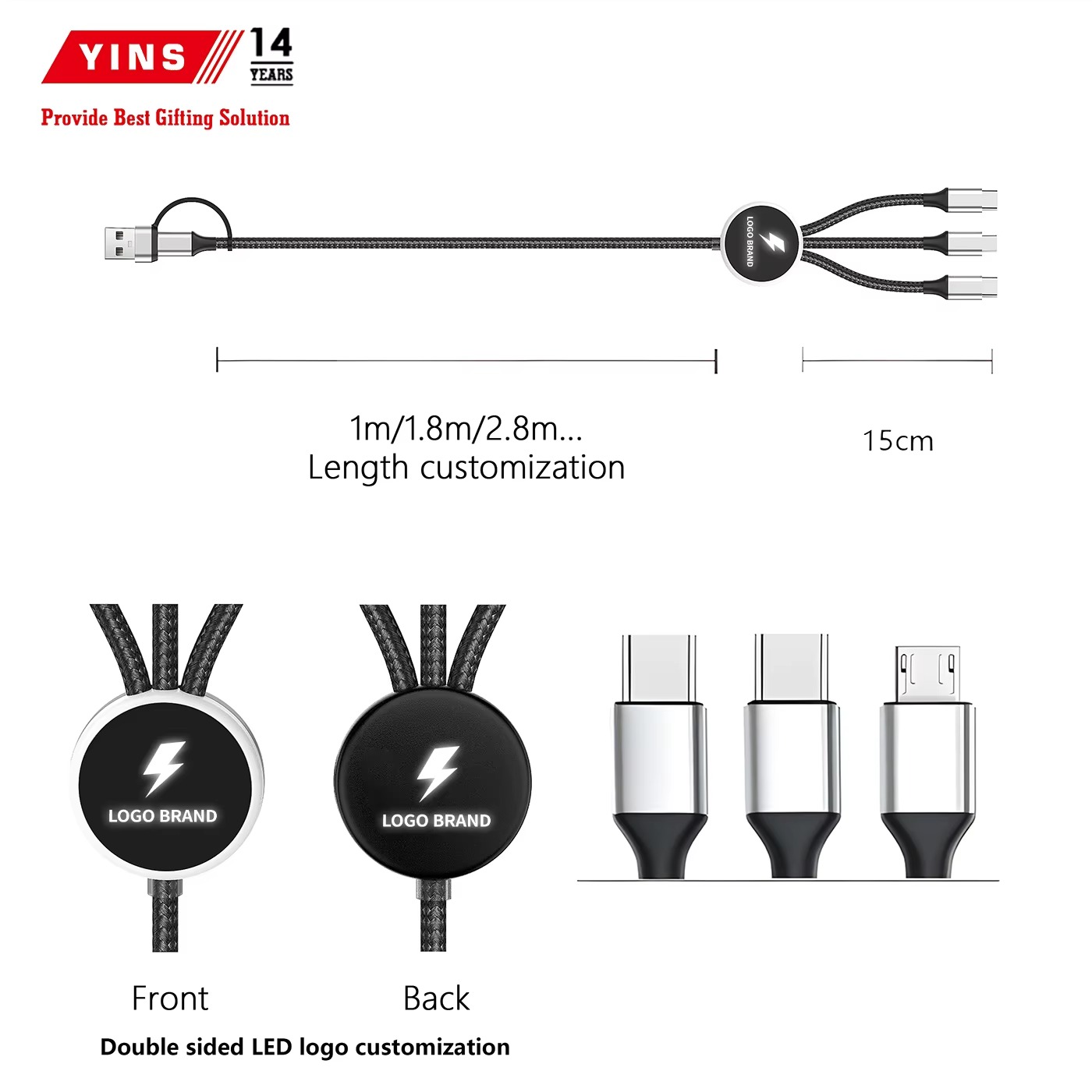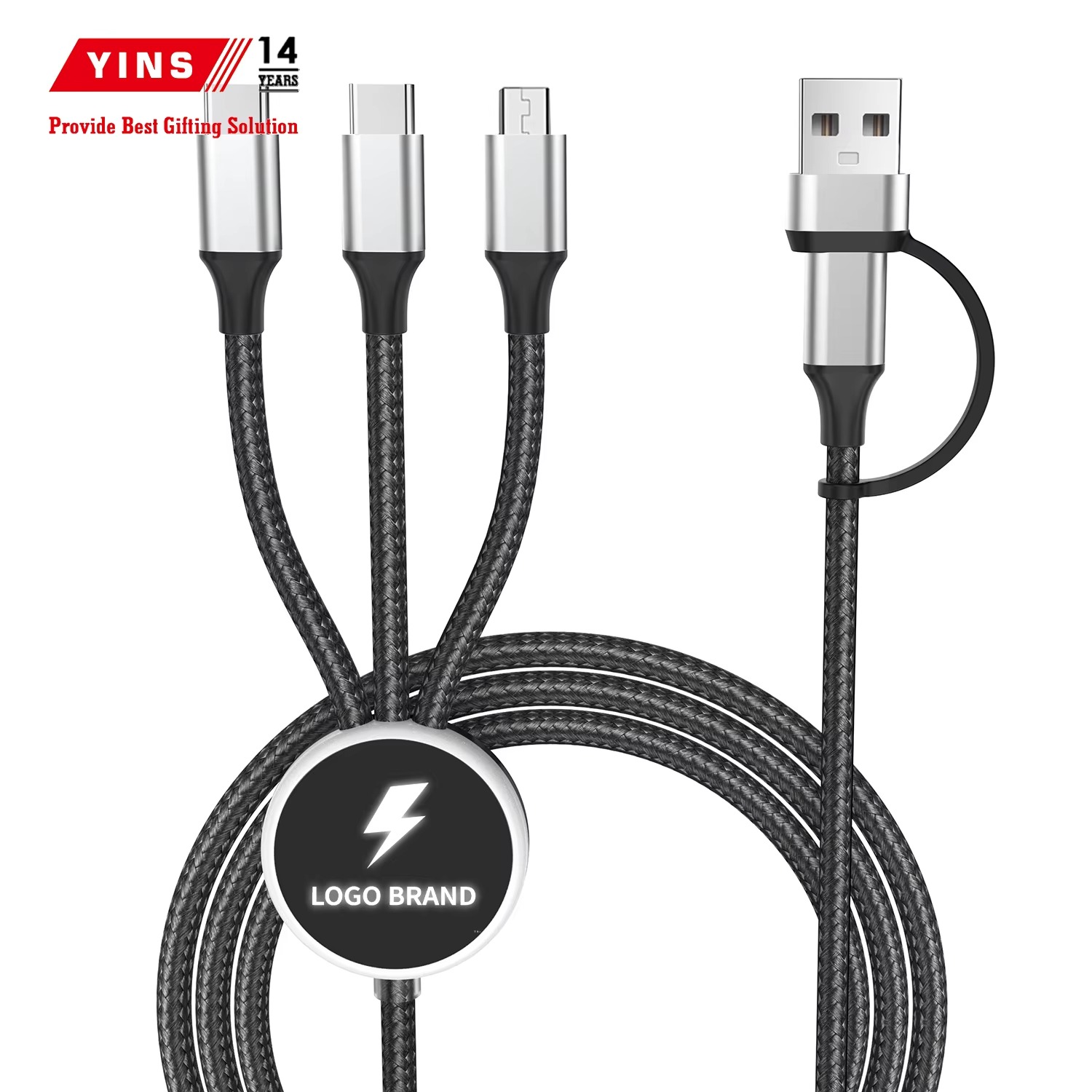 Custom Logo Promotional Gifts Set Nylon Braided 3 in 2 Dual Input Usb Type C Cable 1.2 M With Led Logo Fast Charging Cable