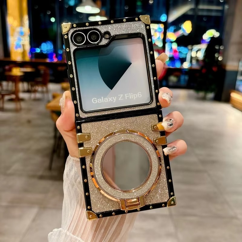 Luxury Glitter Diamond Mirror Bracket Case for Samsung Z Flip 6 5 4 3 Flip6 Flip5 Make up Stand Holder Bling Rhinestone Cover